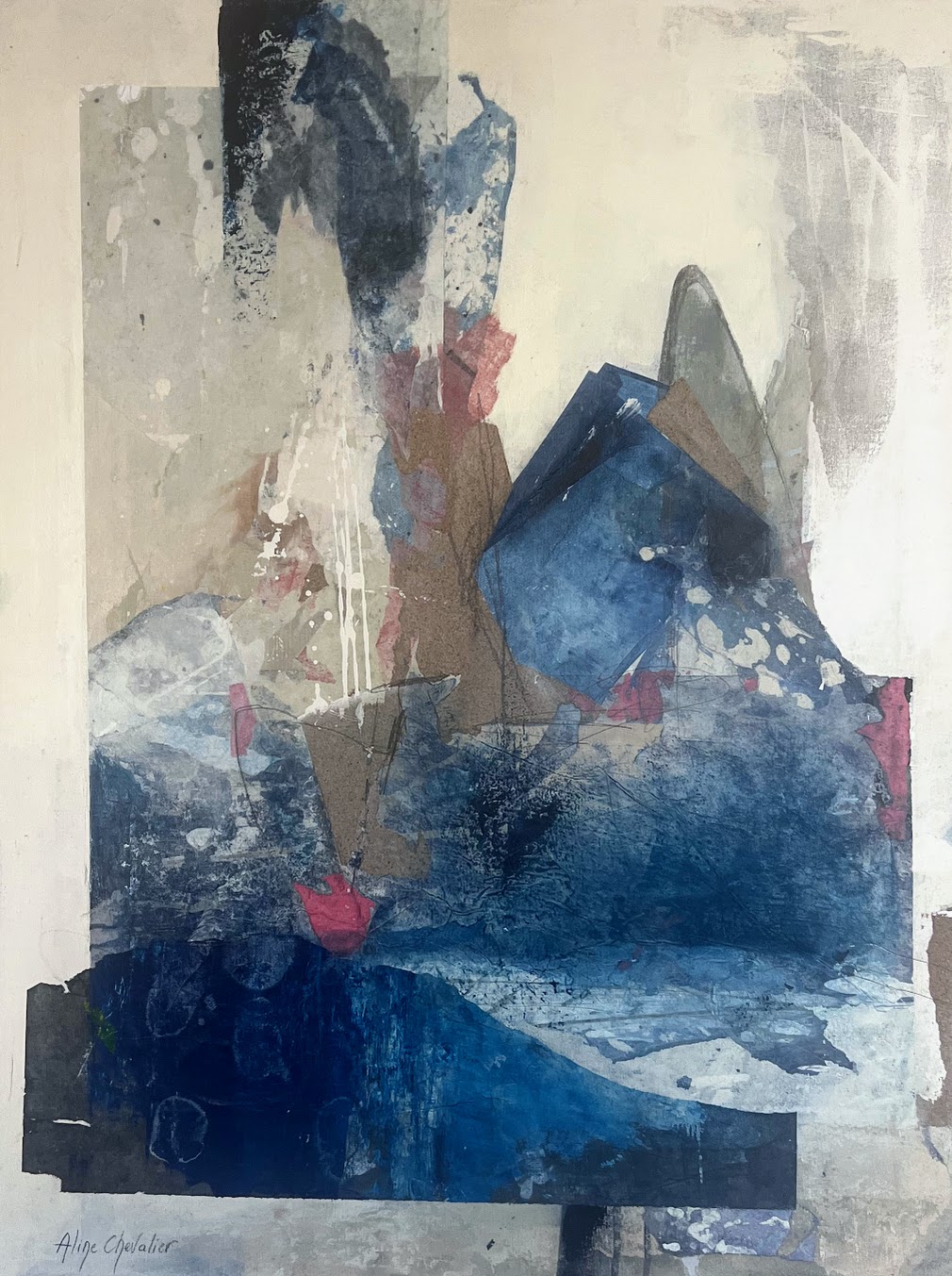 Œuvre abstraite évoquant les strates géologiques du littoral. Composition architecturée aux tons chauds et bleus profonds. Papier artisanal et pigments naturels. 60×80 cm.