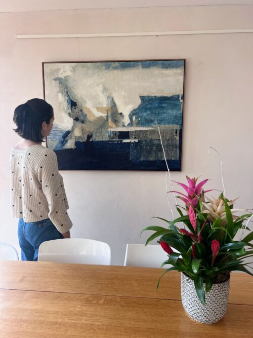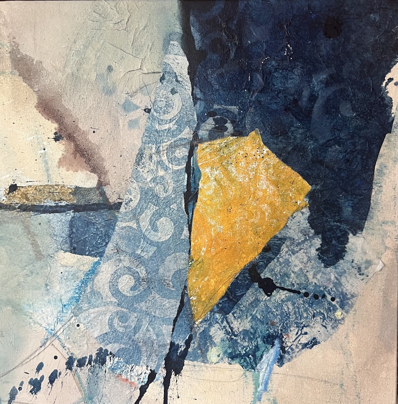 Îlot solaire célèbre ces petits fragments de lumière qui flottent dans l’immensité cosmique. Cette œuvre abstraite de la série Système Solaire évoque la chaleur d’un îlot lumineux, une présence solaire apaisante dans l’obscurité de l’espace. Les jaunes dorés dialoguent avec les bleus profonds — Bleu de Prusse — créant une atmosphère contemplative et lumineuse. Créée sur toile professionnelle avec marqueterie de papier artisanal japonais, chaque fragment a été teinté avec des pigments naturels puis assemblé à la main pour créer cette composition intime et rayonnante. Les formes organiques évoquent la douceur d’un soleil qui réchauffe, la lumière qui apaise. La texture du papier révèle une profondeur vivante qui change avec la lumière naturelle. Format carré 29×29 cm, parfait pour une composition murale ou un espace intimiste. Une œuvre qui invite à la contemplation et à se connecter à la lumière intérieure. Matériaux : Toile professionnelle, papier artisanal japonais, pigments naturels (jaune d’or, Bleu de Prusse, blanc) Format : 29×29 cm