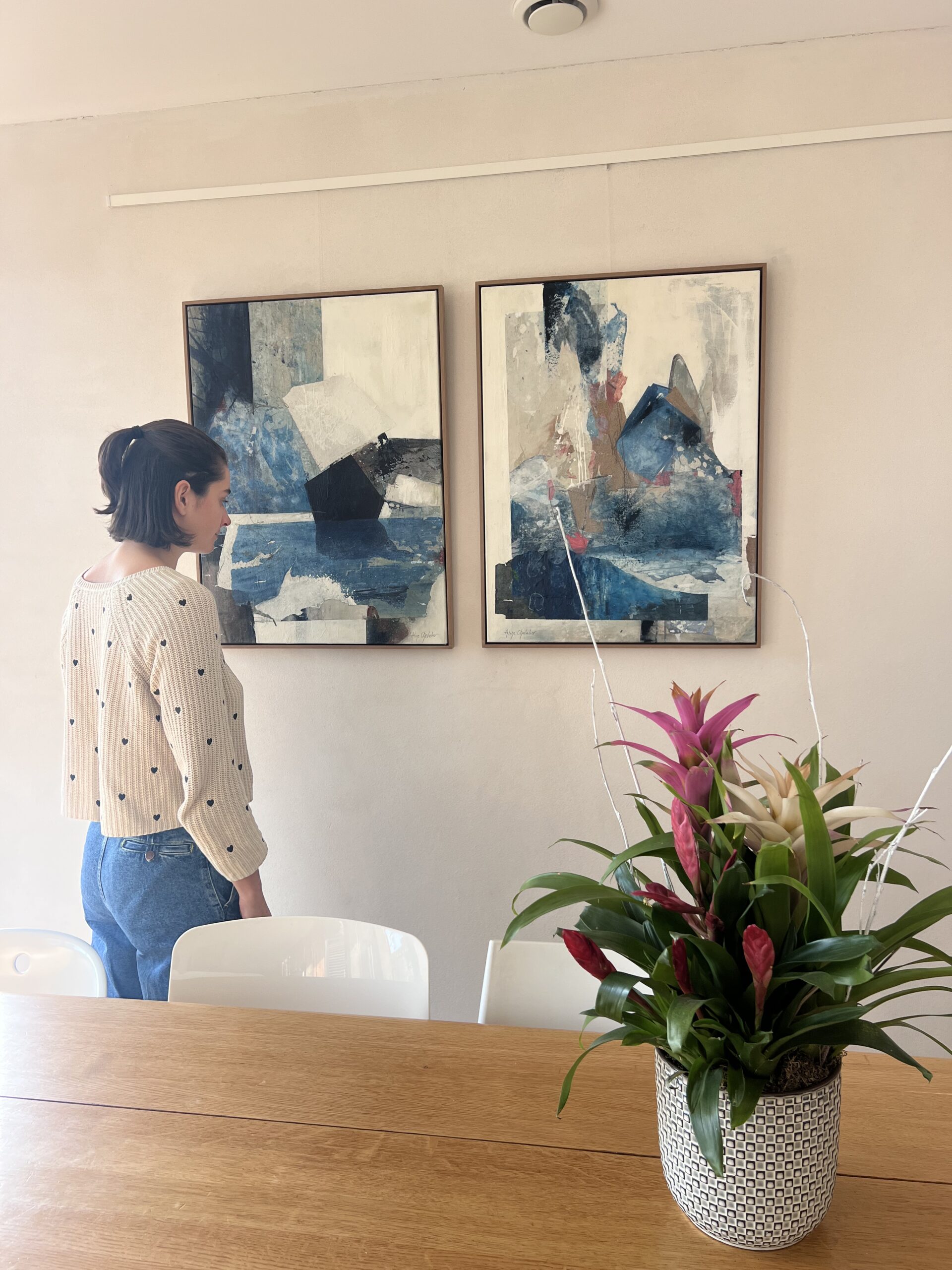 Talweg désigne la ligne qui suit le point le plus bas d’une vallée, un chemin tracé par l’eau au fil du temps. Cette œuvre abstraite capture cette géométrie naturelle, cette architecture invisible façonnée par les courants. Les contrastes marqués entre les bleus profonds — Bleu de Prusse, noirs — et les tonalités claires créent une composition graphique et contemplative. Créée sur toile professionnelle avec marqueterie de papier artisanal japonais, chaque fragment a été teinté avec des pigments naturels puis assemblé à la main. Les formes angulaires et organiques dialoguent, évoquant les reliefs sous-marins et les strates géologiques sculptées par l’eau. La texture du papier révèle une profondeur qui change avec la lumière, créant des jeux d’ombre et de lumière comme les vallées sous-marines révélées par les courants. Montée avec caisse américaine bois brut, cette pièce transforme votre intérieur en espace de contemplation. Une œuvre qui invite à explorer les paysages invisibles et à se connecter à la force tranquille de la nature. Matériaux : Toile professionnelle, papier artisanal japonais, pigments naturels (Bleu de Prusse, noir, gris, blanc naturel), caisse américaine bois brut